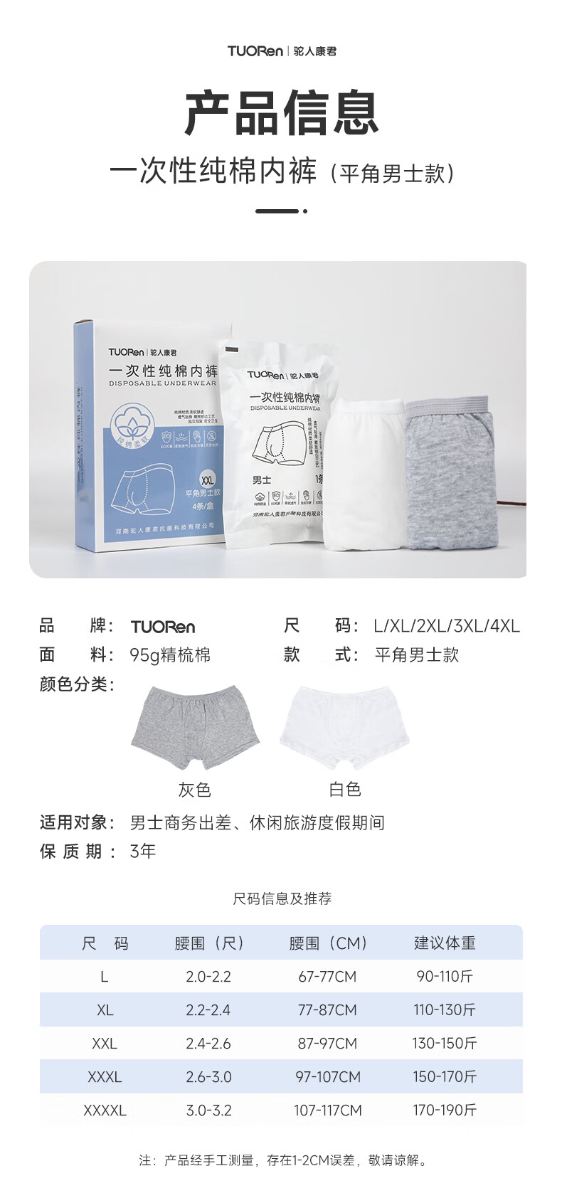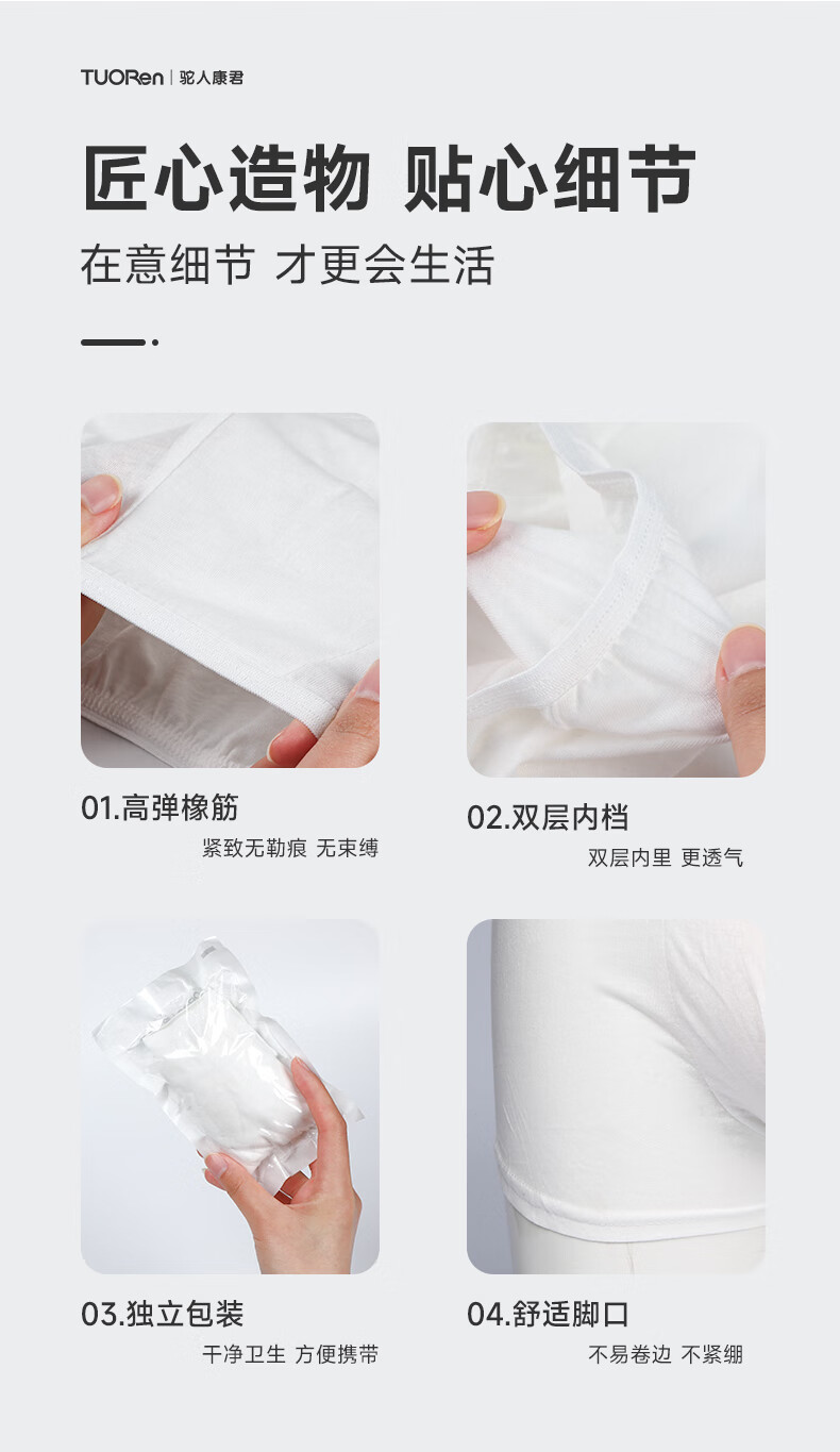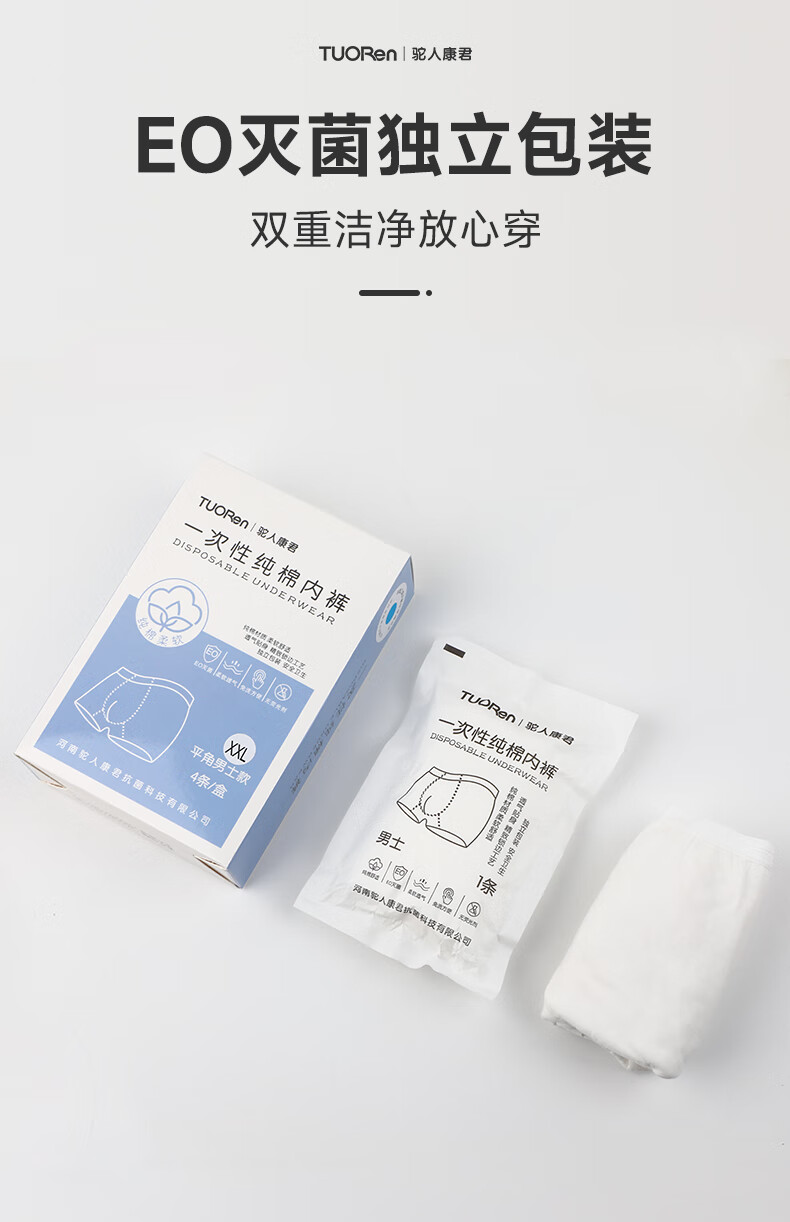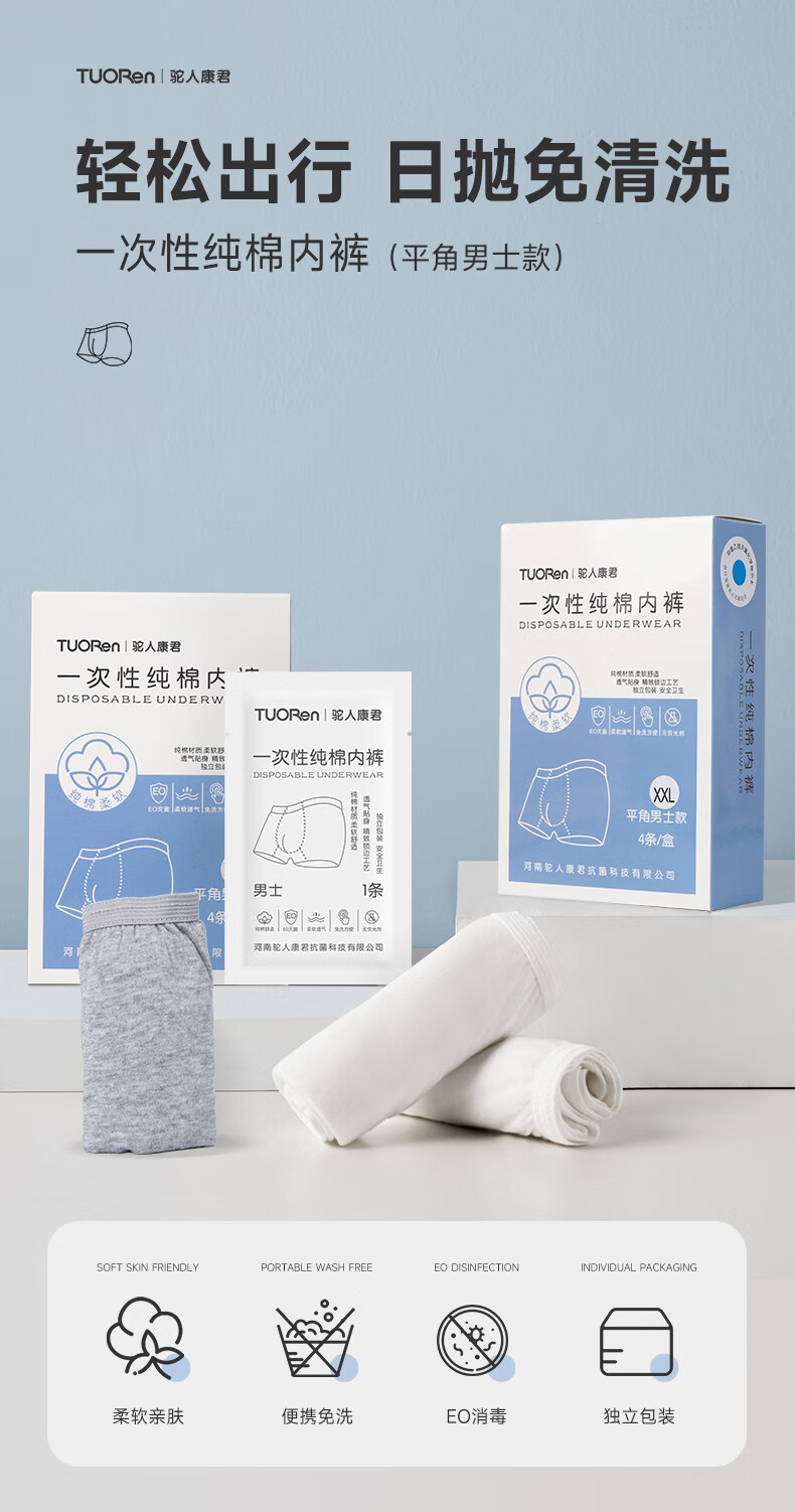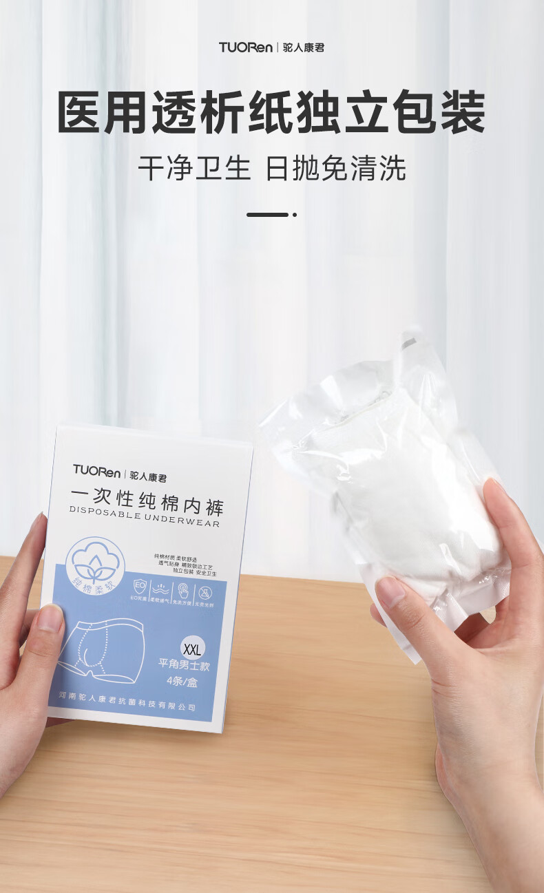 驼人康君平角一次性内裤男免洗独立装商务出差度假军训一次性内裤 4条装 白色 L