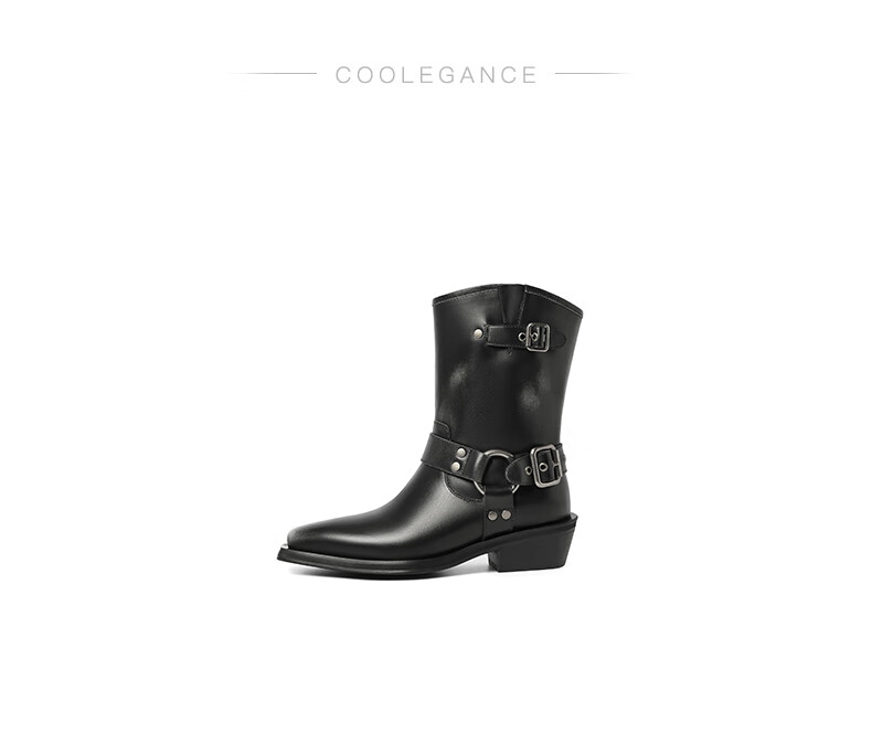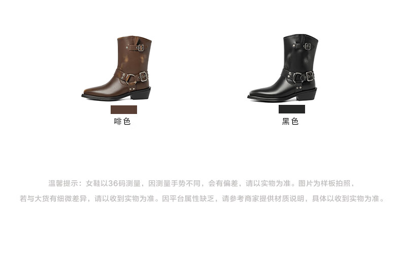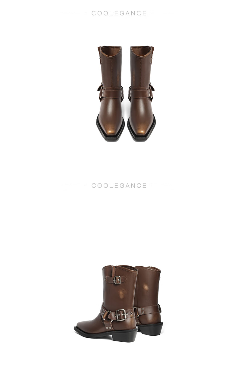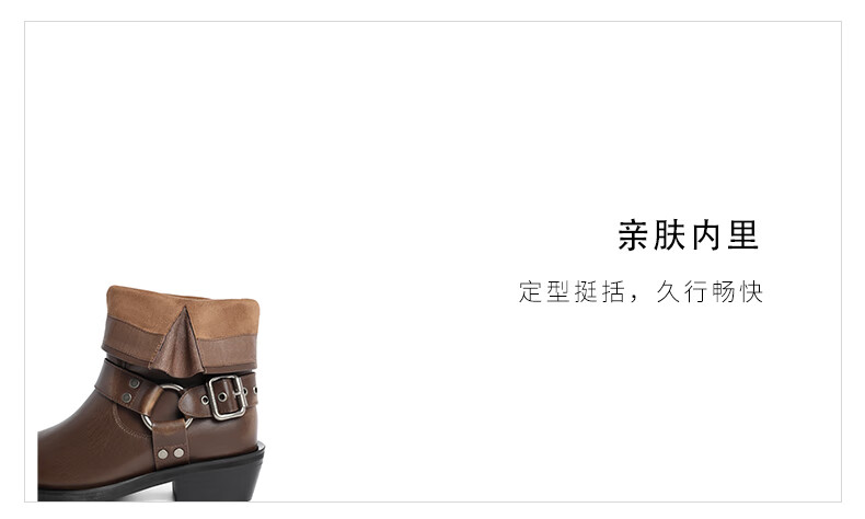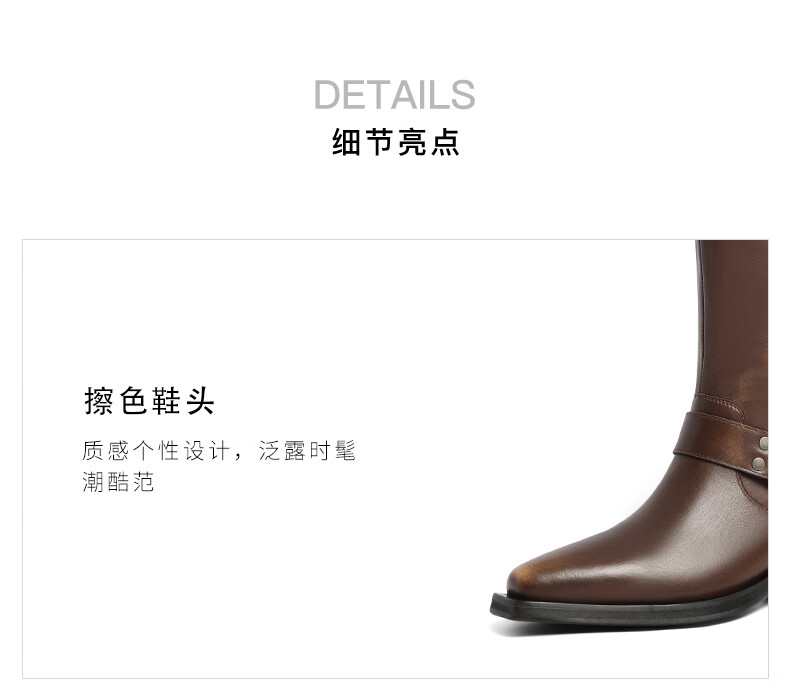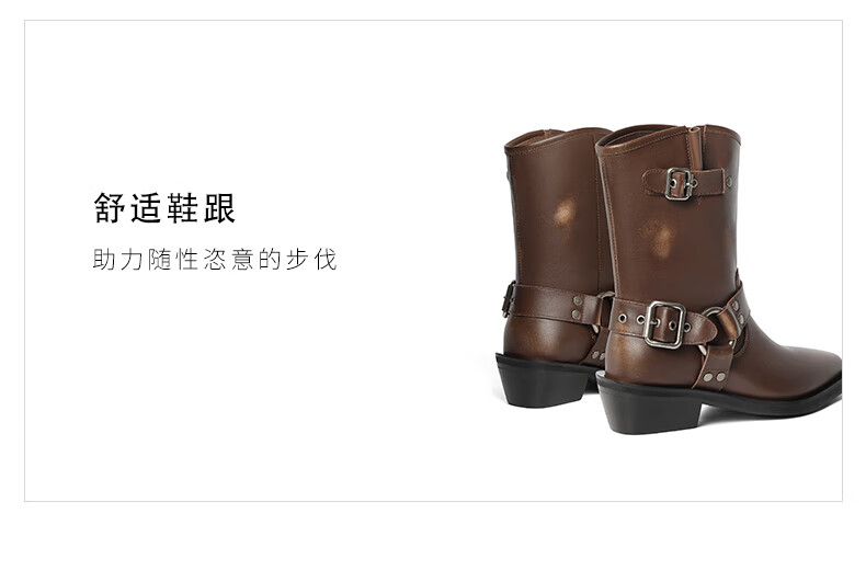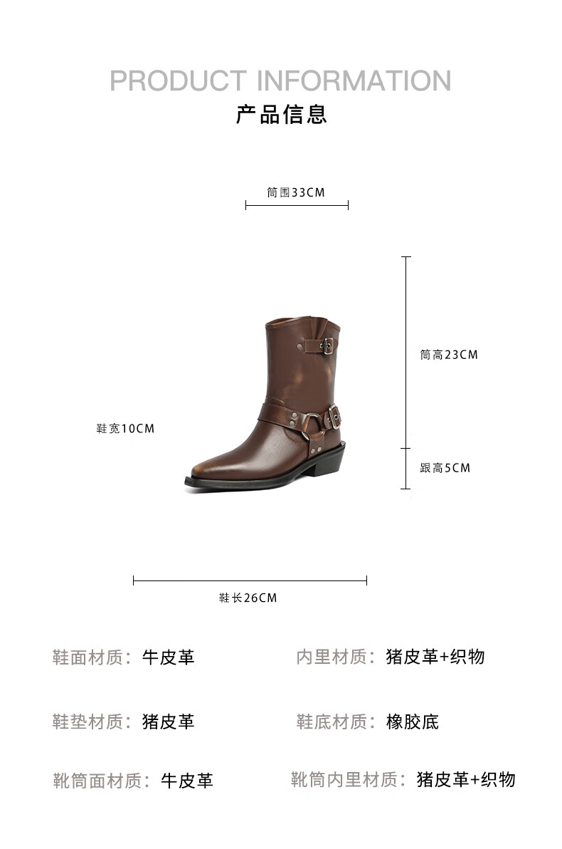 百丽复古金属扣机车靴女23冬季新款潮酷牛皮骑士靴B1491DZ3预售 棕色 34